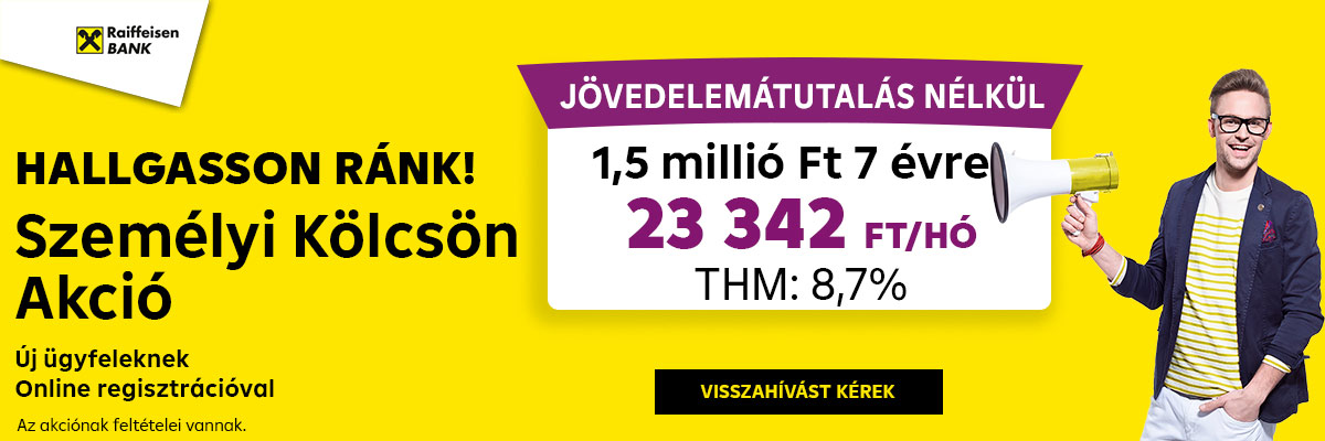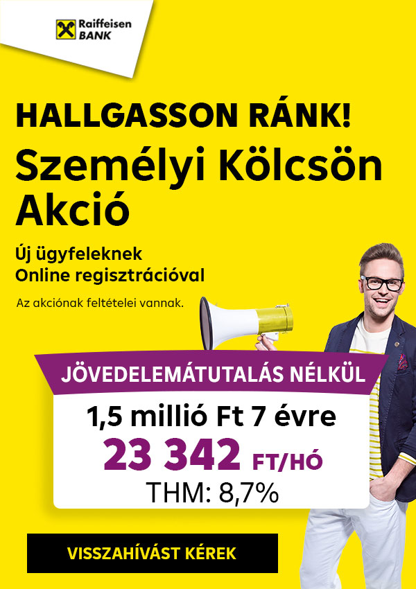 Új Ügyfél Jövedelem250 online akcióval: kölcsönösszeg: 3.000.000 Ft; futamidő: 60 hó; hitelkamat mértéke: 7,95% a futamidő végéig; hitelkamat típusa: rögzített; THM: 8,7%; fizetendő teljes összeg a futamidő alatt: 3.675.445 Ft; hitel teljes díja: 675.445 Ft, hitelbírálati díj: 30.000 Ft, kamat összege: 645.445 Ft; havi törlesztőrészlet összege: 60.757 Ft. A feltételek változása a feltüntetett adatokat módosítja.